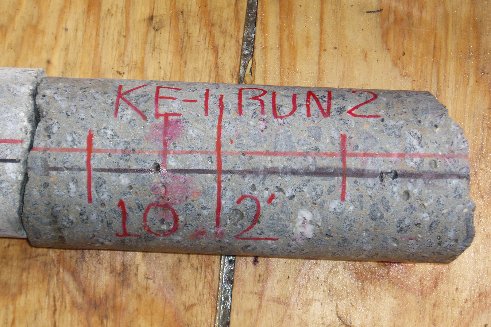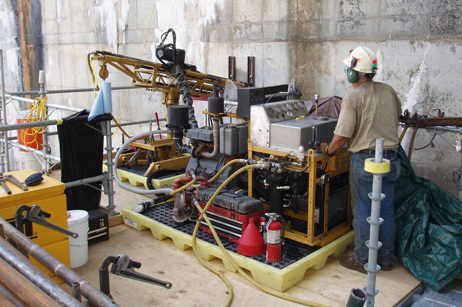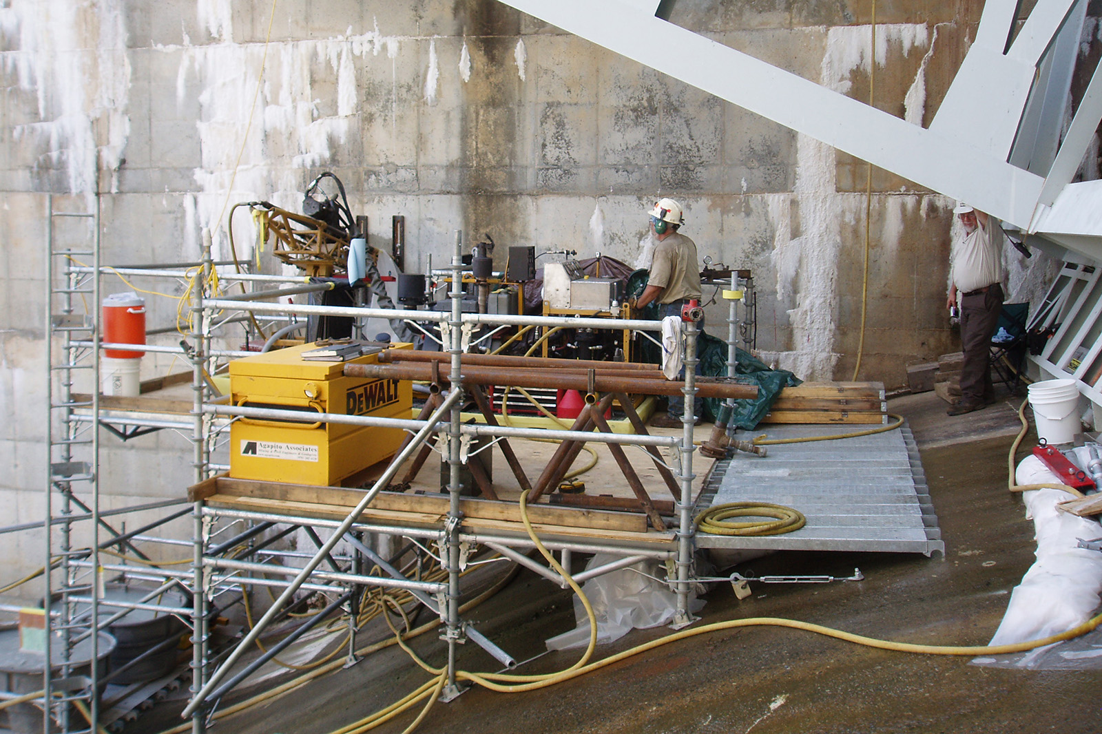 - Six NX wireline (NXWL) observation and concrete sampling core holes were drilled: two angle core holes into the west end wall from a work deck in the Gate 1 spillway bay; two angle core holes drilled into the east end wall from a work deck in the Gate 4 spillway bay; and two vertical NXWL core holes, one through each of the abutments adjacent to spillway bays 1 and 4
